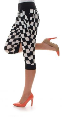 Oryginalne spodenki w modne, blogerskie wzory. Wygodne rybaczki typu alladynki o długości 3/4 z kieszeniami z przodu. Czarno-białe spodnie / szorty na gumce w pasie. Nogawki zakończone elastycznym ściągaczem.Skład: 80% poliester, 15% bawełna, 5% spandex