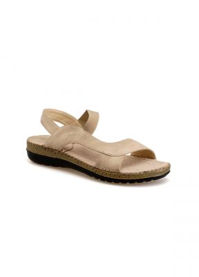 Damskie sandały z miękką, skórzaną wkładką, gruba podeszwa oraz odpowiednio wyprofilowana wkładka, stopy podtrzymuje elastyczny pasek, łączenie podeszwy z wkładką w postaci grubych szwów.