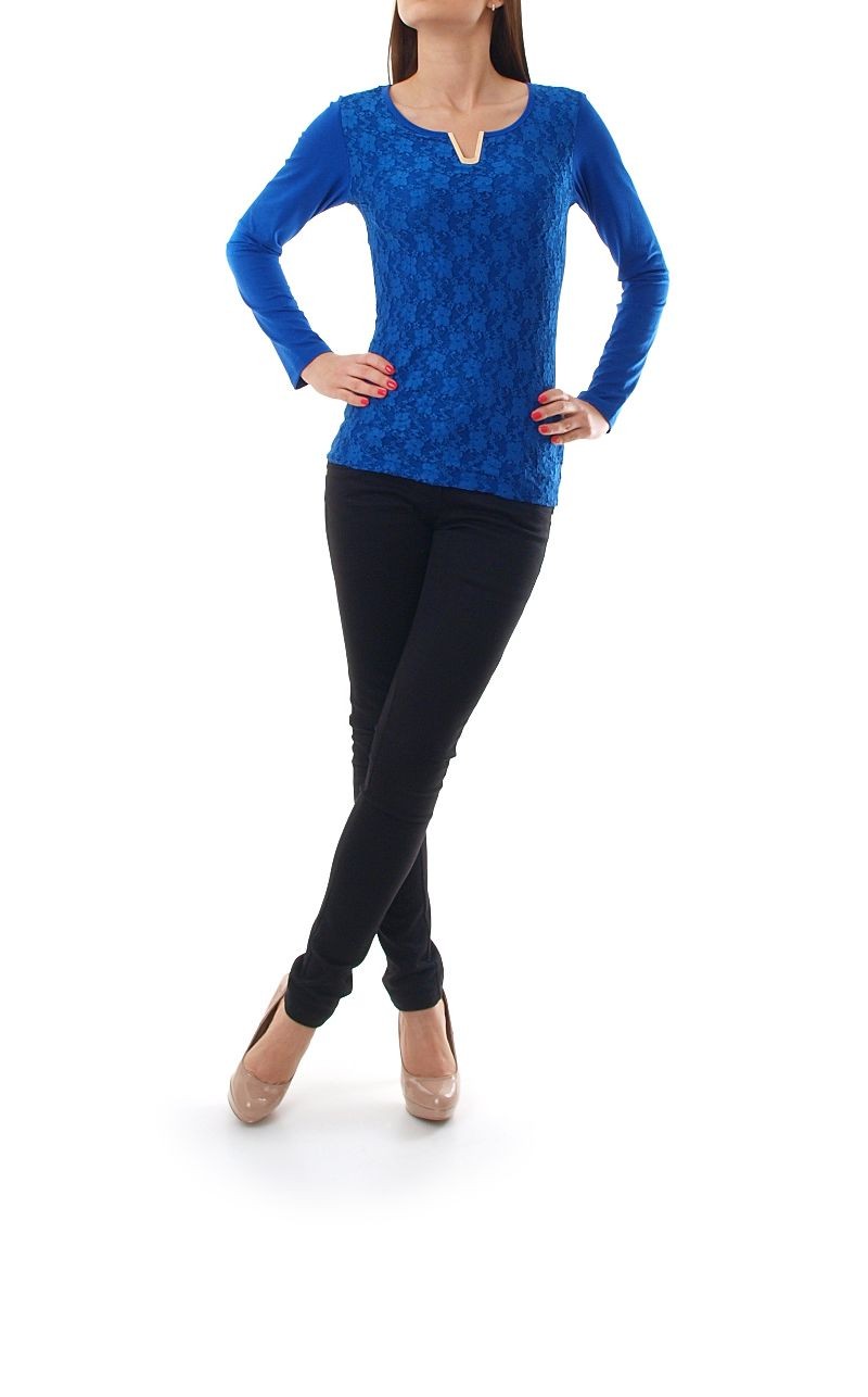Elegancka, bawełniana bluzka z efektownym dekoltem. Koszulka z długim rękawem. Z przodu piękna delikatna koronka, tył oraz rękawy gładkie. Przyjemna w dotyku, wykonana z dobrej jakości materiałów. Stylowa i bardzo modna bluzka na każdą okazje.Skład: 95% bawełna, 5% lycra.