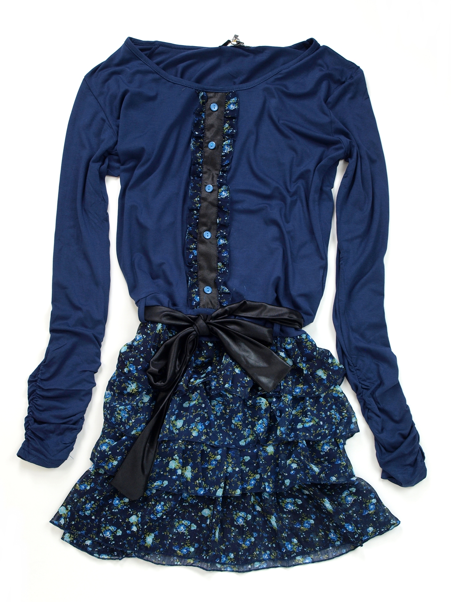 Kobieca sukieneczka ze zwiewnymi falbankami, w pasie wiązana tasiemką. Długie marszczone rękawy.Skład: 95% wiskoza, 5% elastan.
