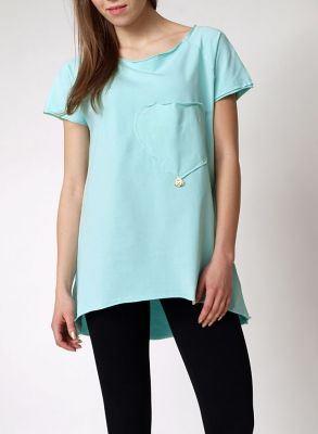 Wyjątkowa, bardzo kobieca tunika. Rozkloszowany, trapezowy krój, bardzo modny w tym sezonie. Bluzka z krótkim rękawem. Z przodu duża kieszeń w kształcie serca. Dekolt okrągły. Surowo wykończona. Asymetryczna, tył delikatnie dłuższy od przodu. Miły w dotyku bawełniany materiał. Luźna, zwiewna i bardzo wygodna.Skład: 95% bawełna, 5% elastan.