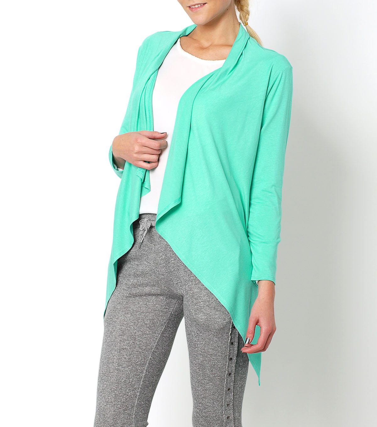 Kardigan/narzutka, luźno opadający kołnierz, długi rękaw, przód dłuższy, materiał elastyczny.Modelka wzrost 175cm, na co dzień nosi S/M, rozmiar z prezentacji produktu M/L