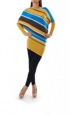Szeroki sweter typu kimono. Nietoperz w skośne, kolorowe paski. Elastyczny, ładnie dopasowuje się do sylwetki. Wygodne, bardzo komfortowe kimono. Gruba, długa tunika, idealna do legginsów oraz grubych rajstop. Skład: 40% wełna, 35% wiskoza, 25% elastan.