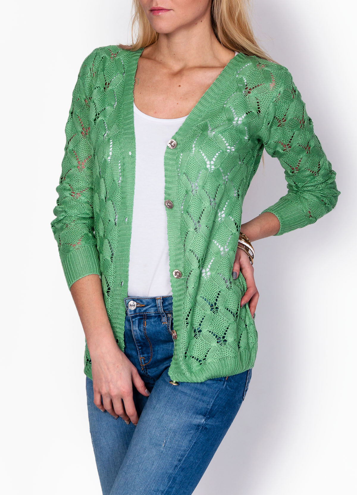 Piękny rozpinany kardigan z długim rękawem. Sweterek wykonany z przyjemnej dzianiny o ozdobnym, ażurowym splocie. Dół oraz rękawki zakończone ściągaczami. Szeroki dekolt w serek. Sweter zapinany na ozdobne, połyskujące guziki. Niezwykle praktyczny oraz zawsze modny. Idealny na chłodniejsze letnie wieczory oraz jesienne dni. Do wyboru śliczne kolory, które dodadzą uroku każdej stylizacji.Modelka wzrost 175cm, na co dzień nosi rozmiar S/M
