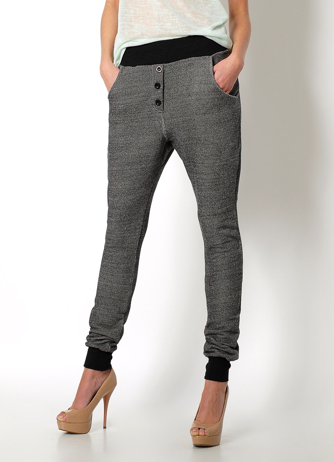 Spodnie z obniżonym krokiem. W pasie elastyczny ściągacz. Z przodu imitacja rozporka z guzikami. Na przodzie oraz z tyłu kieszenie. Nogawki wykończone ściągaczem. Materiał: 95% bawełna, 5% elastan. Modelka: wzrost 175 cm, na co dzień nosi S/M, rozmiar z prezentacji produktu M.