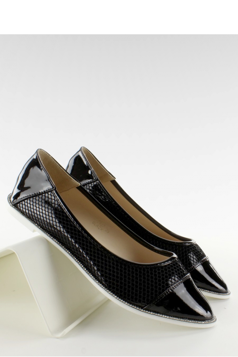 Eleganckie balerinki damski z noskami w delikatny szpic. Osadzone na białej podeszwie , dodającej butom lekkości i świeżości. Dookoła drobniutkie cyrkonie . Wierzchnia część pokryta stylową siateczką, a noski z lustrzanym połyskiem. Bardzo oryginalny fason, pięknie wyglądają na stopie.