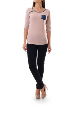 Piękna bluzeczka z rękawem 3/4. Bluzka z jeansowymi wstawkami. Na wysokości piersi mała kieszonka. Na ramieniu ozdobne guziczki. Bardzo wygodna i praktyczna taliowana koszulka. Dokładnie wykończona, przyjemna w dotyku bawełniana bluzka.Skład: 95% bawełna, 5% lycra.