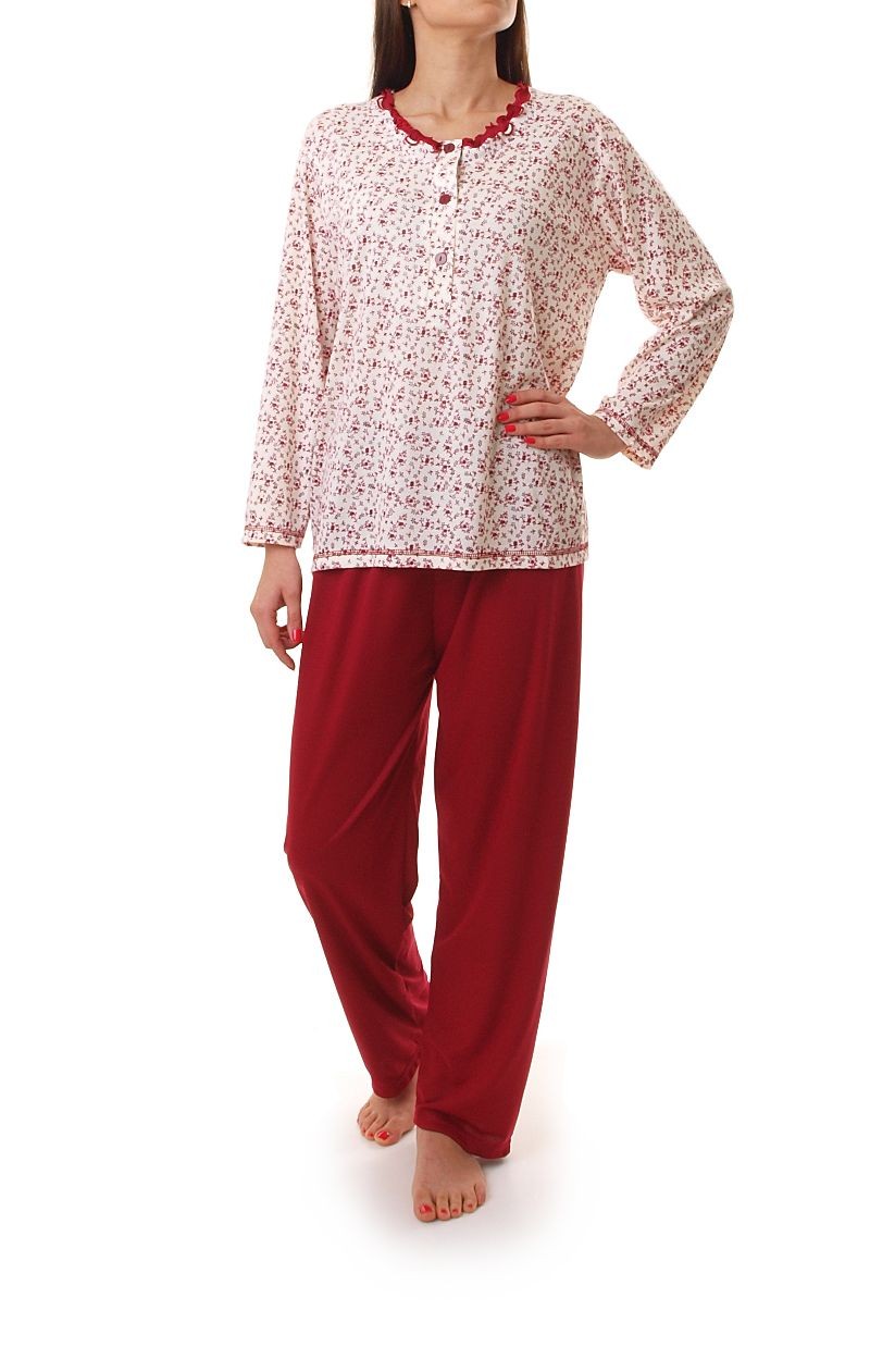 Przyjemna, bardzo wygodna bawełniana piżama. Komplet spodnie plus koszulka. Spodnie na elastycznej gumce. Długie nogawki. Koszulka z długim rękawem. Dekolt zapinany na guziczki. Kołnierzyk wykończony uroczą, delikatną falbanką. Luźna, komfortowa piżama z motywem kwiatowym. Skład: 100% bawełna