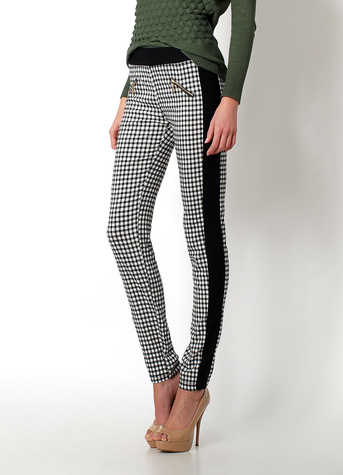Klasyczny krój spodni z gumka w pasie. Wzdłuż nogawek jednolite wstawki. Elastyczne spodnie posiadają z tyłu zaszewki imitujące kieszenie. Na przodzie dekoracyjne suwaki. Materiał: 100% bawełna.Modelka: wzrost 175 cm, na co dzień nosi S/M, rozmiar z prezentacji produktu S/M.
