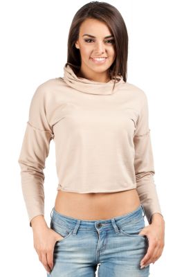 Gładka, dzianinowa bluza z długimi kimonowymi rękawami. Długość bluzy do talii. Dół bluzy i rękawy niewykończone. Pod szyją wywijany golf.