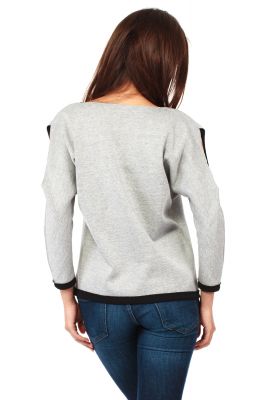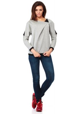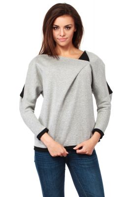 Gładka bluza z asymetryczną zaszewką z przodu i kimonowymi rękawami wykonana z dwustronnego neoprenu - pianki. Na ramionach podłużne rozcięcia. Szeroki dekolt. Rękawy i dół bluzy z kontrastowymi wykończeniami.
