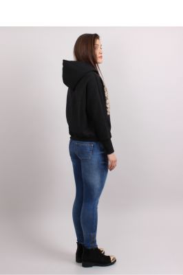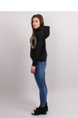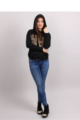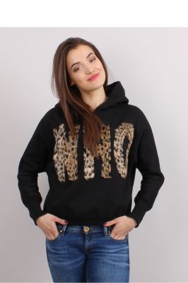 Stylowa bluza z kapturem, idealna do spodni z wysokim stanem. Jest bardzo mięsista w dotyku. Z przodu wyjątkowo oryginalna aplikacja w postaci napisu wyszywanego futerkiem z motywem leopar.