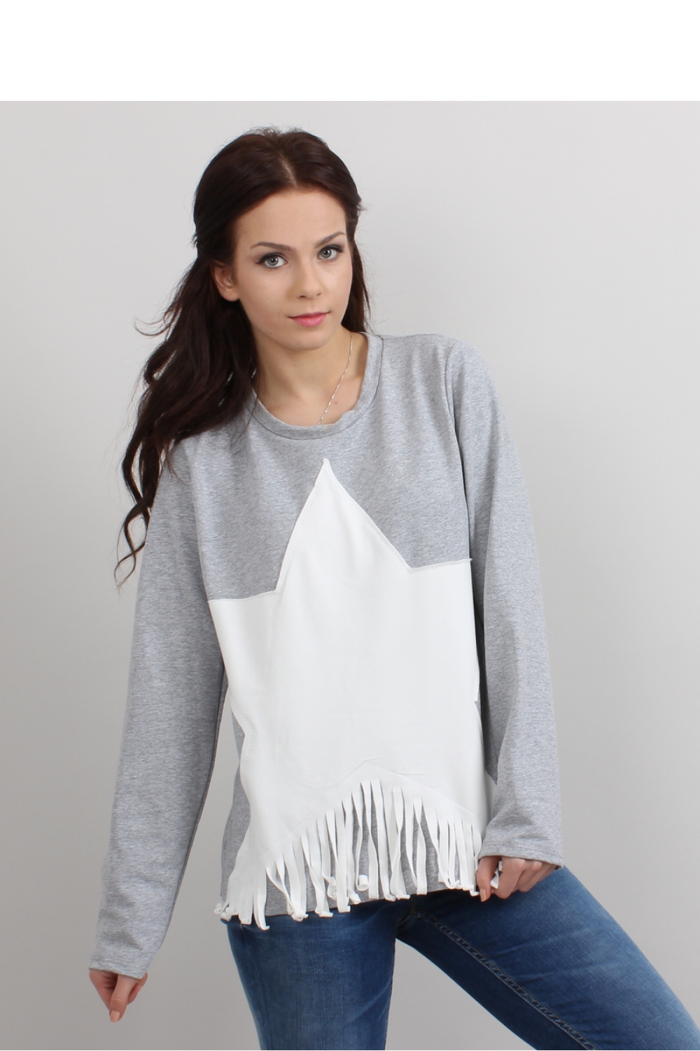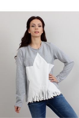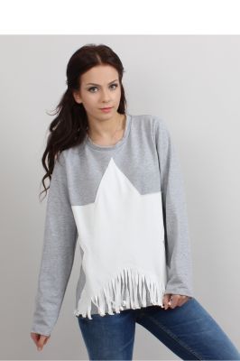 Bluza damska z długim rękawem z bardzo oryginalną naszywką w postaci gwiazdy, zakończonej frędzelkami. Jest miękka i bardzo mięsista.