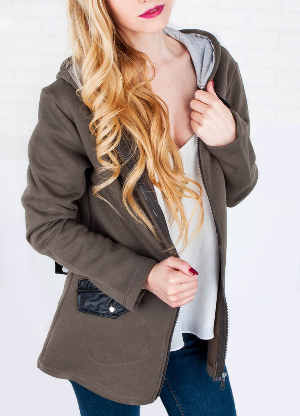 Oversizowa bluza - narzutka dresowa, z kapturem. Wykonana z mięciutkiej w dotyku dresowej dzianiny, która ładnie układa się na sylwetce. Z tyłu kaptur. Długie rękawy. Zapinana za zamek. Wewnątrz ocieplana przyjemnym w dotyku polarem. Z przodu dwie wsuwane kieszenie, ozdobione materiałem z eko skóry. W kapturze sznurek. Kolor zamka w bluzie może być inny niż na zdjęciu (wybierany losowo). Ciekawe połączenie kolorystyczne. Produkt turecki dobrej jakości.Modna bluza doskonale połączy się z sukienkami dresowymi, spódniczkami, czy jeansami czy innymi spodniami. Ładnie układa się na sylwetce maskując niedoskonałości figury. Będzie odpowiednia na różne okazje: zarówno do strojów codziennych, jak i nieco bardziej formalnych stylizacji, dodając strojom casualowego uroku. Idealna na chłodniejsze dni jesieni, świetna alternatywa dla długich swetrów czy tradycyjnych bluz dresowych. Materiał 95% bawełna, 5% lycraModelka wzrost 170cm, na co dzień nosi rozmiar S