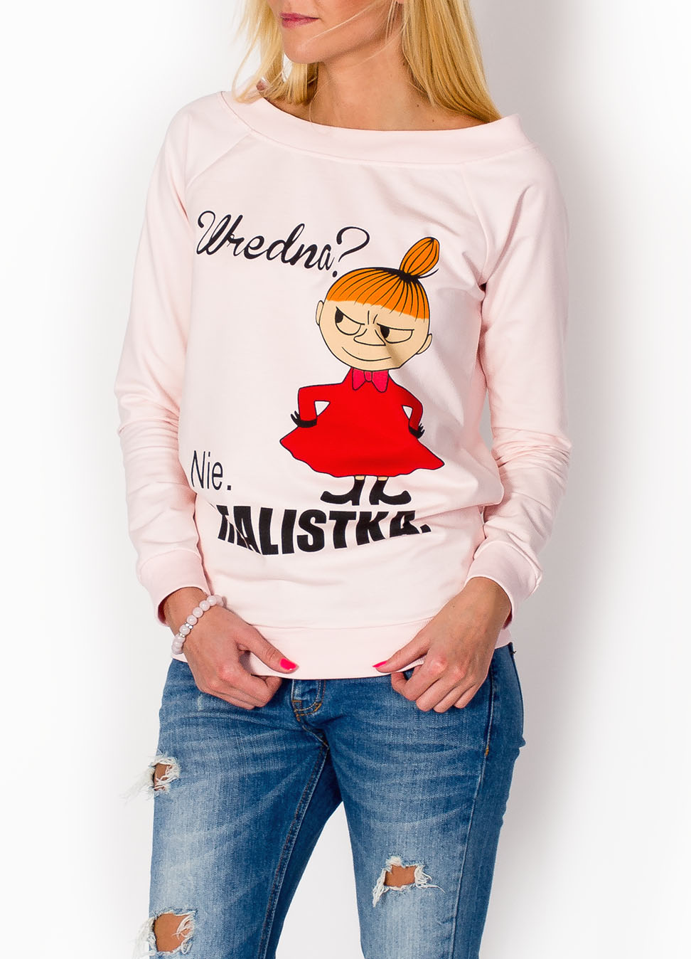 Bluzka z nadrukiem wykonana z dresowego materiału. Posiada luźniejszy fason.Rękawy długie. Dół, rękawy oraz dekolt typu łódka, wykończone szerokim ściągaczem.Bluza z Małą Mi, charakterystyczną postacią ze znanej bajki, będzie modnym dodatkiem do garderoby.Produkt turecki dobrej jakości.Materiał 60% bawełna, 35% poliester, 5% elastanModelka wzrost 175cm, na co dzień nosi rozmiar S/M