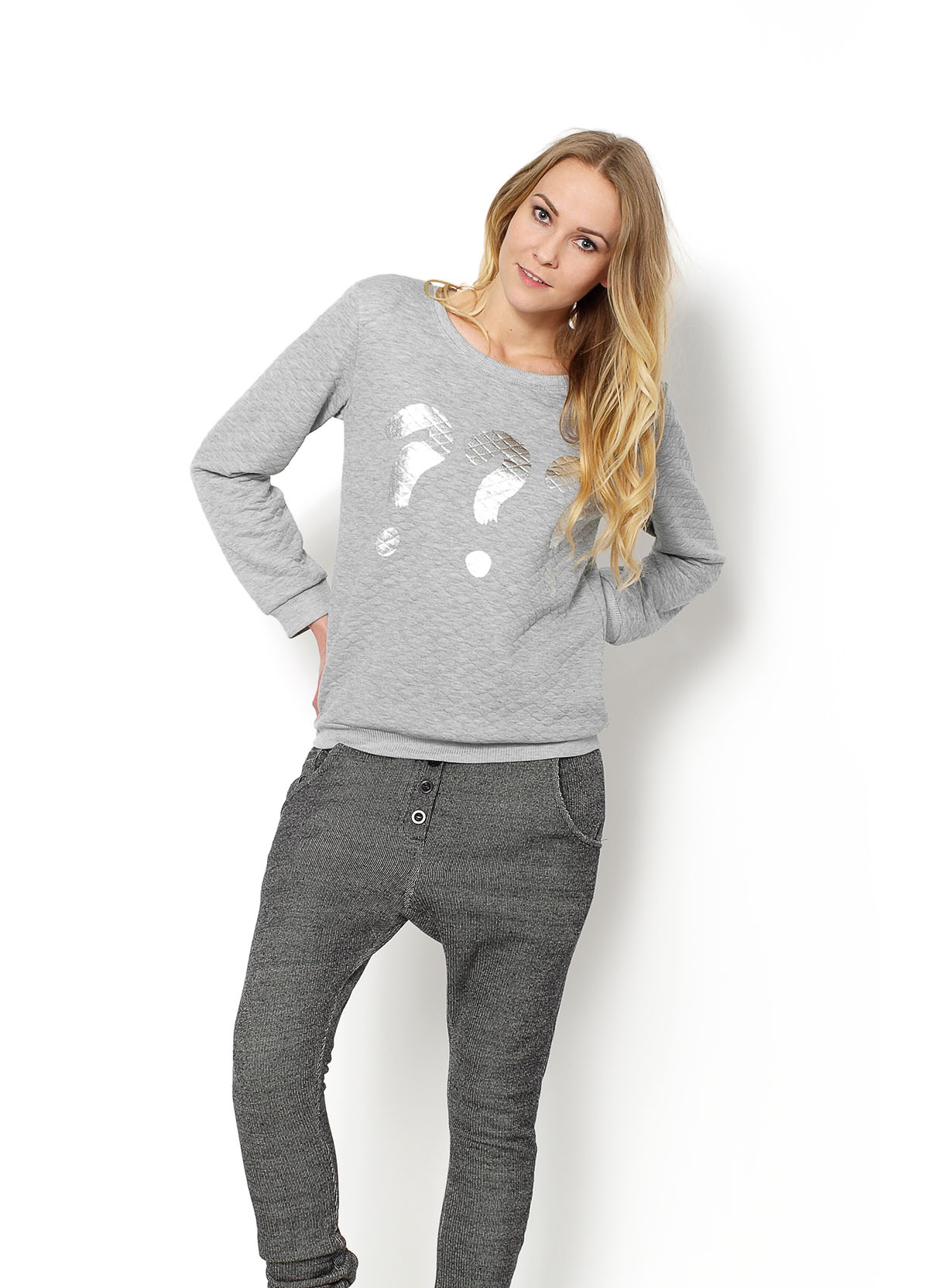 Pikowana bluza, na dole bluzy i rękawów ściągacze, dekolt okrągły, z przodu srebrny nadruk w postaci znaków zapytania.Materiał 65% bawełna, 35% poliesterModelka wzrost 175cm, na co dzień nosi S/M, rozmiar z prezentacji produktu S/M.