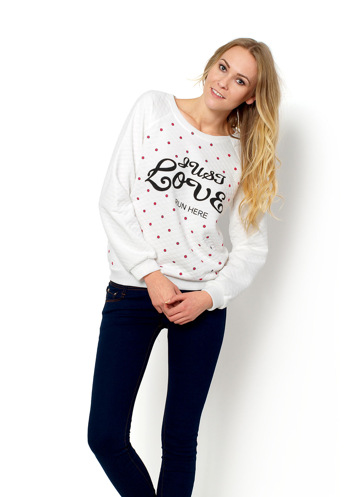 Bluza, dół i rękawy zakończone ściągaczem, dekolt okrągły, faktura materiału pikowana, z przodu nadruk i groszki.Materiał 65% bawełna, 35% poliesterModelka wzrost 175cm, na co dzień nosi S/M, rozmiar z prezentacji produktu S/M