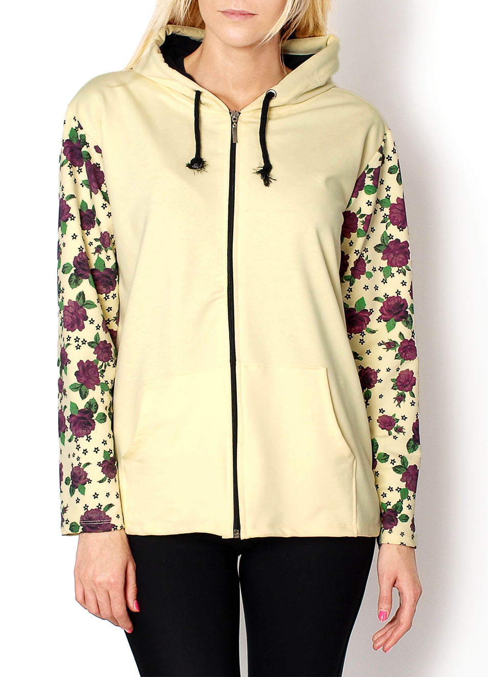 Bluza z kapturem, zapinana na zamek. Długie rękawy z nadrukiem w kwiaty. Z przodu praktyczna kieszeń typu kangurka.Wygodna i niebanalna, z ciekawym nadrukiem. Świetne dopełnienie stroju codziennego np. z dżinsami czy spodniami dresowymi.Materiał 95% wiskoza, 5% lycraModelka wzrost 175cm, na co dzień nosi rozmiar S/M