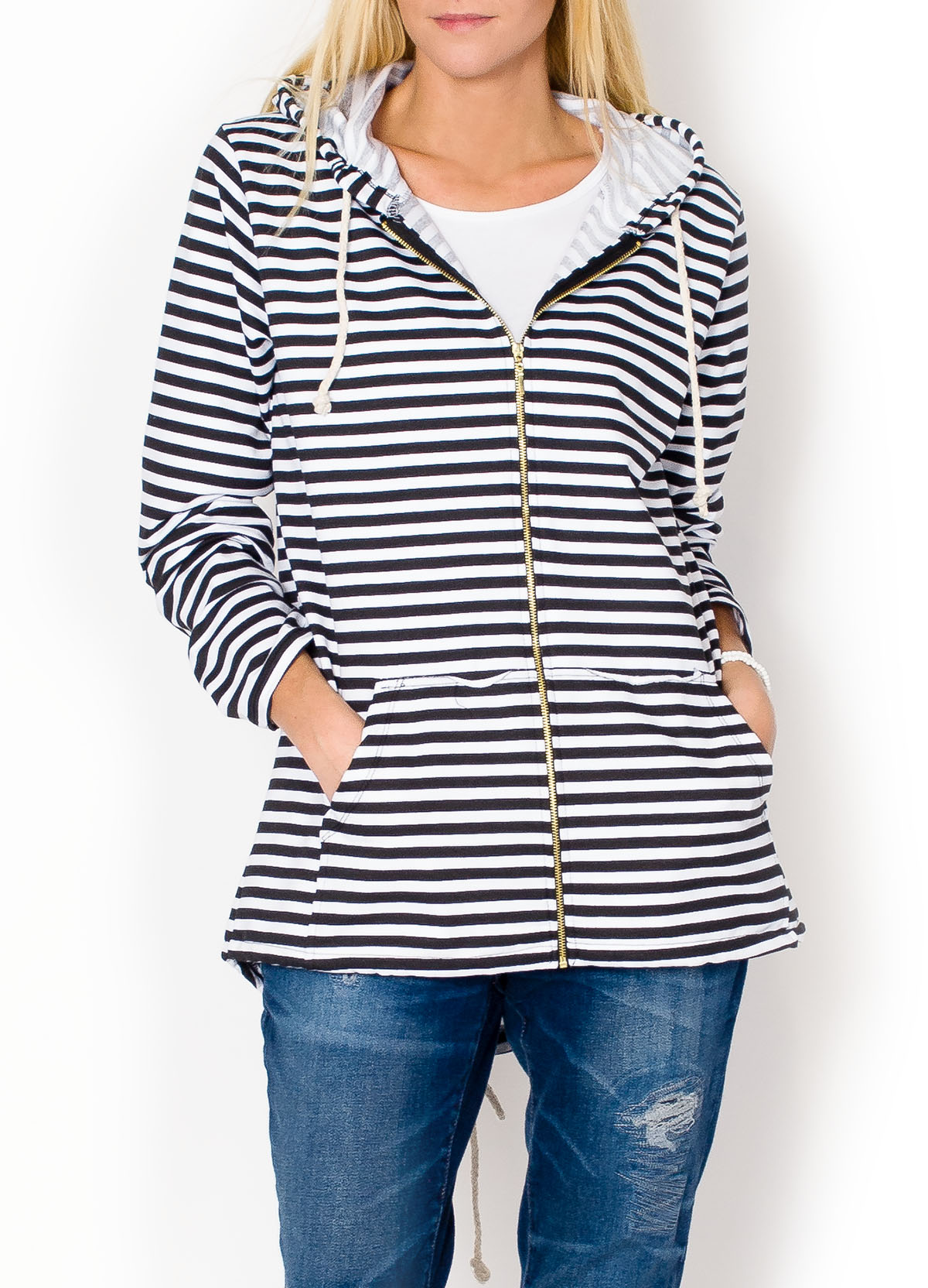 Rozpinana bluza z kapturem. Długie rękawy. Z przodu duże wsuwane kieszenie. Dół inspirowany popularną parką, z rozcięciem oraz sznurkiem do ściągnięcia.Nieco oversizowy krój, który zapewnia komfort i swobodę ruchów podczas noszenia.Bluza w streetowym stylu, w sam raz na nadchodzące miesiące. Paski to efektowny, bardzo uniwersalny wzór, doskonale sprawdza się w codziennej garderobie. Materiał 60% bawełna, 35% poliester, 5 % elastanModelka wzrost 175cm, na co dzień nosi rozmiar S/M