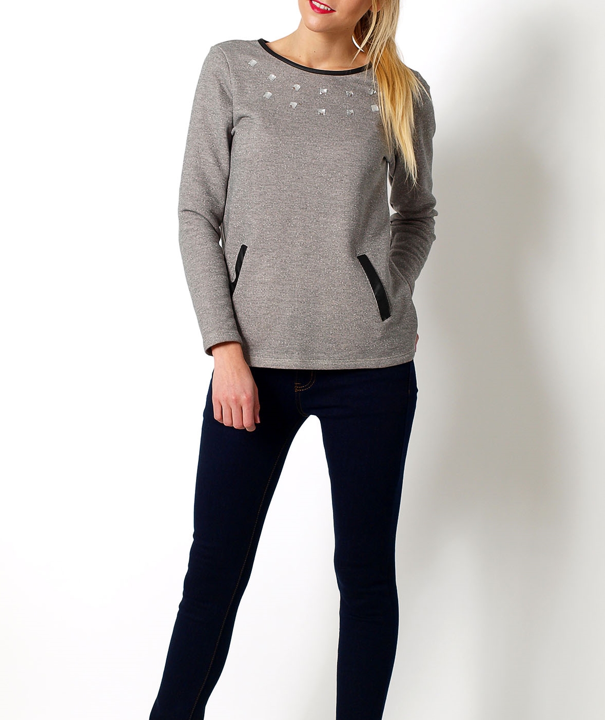 Bluza melanżowa, od wewnątrz z meszkiem, dekolt okrągły zakończony lamówką z ekoskóry, z przodu wokół dekoltu zdobienia z kamieni, z przodu wsuwane kieszenie z lamówką z ekoskóry. Materiał 90% bawełna, 10% elastan.Modelka wzrost 175cm, na co dzień nosi S/M, rozmiar z prezentacji produktu M