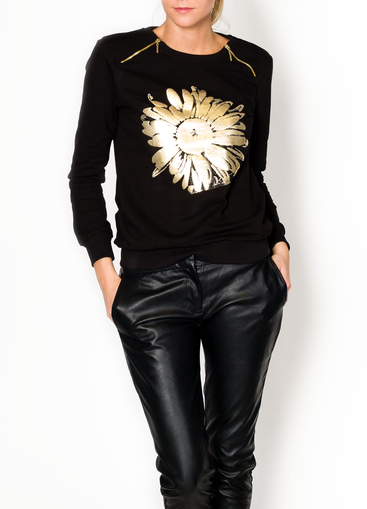 Gładka bluza damska ze złotymi zamkami i modną błyszczącą aplikacją - złoty kwiat. Wykonana z dobrego gatunkowo materiału. Okrągły dekolt z rozpinanymi złotymi zamkami. Rękawy i dół bluzy wykończone ściągaczem. Do wyboru modne kolory. Produkt turecki świetnej jakości.Kobieca bluzka z połyskującym nadrukiem, wygodna, praktyczna i komfortowa. Wspaniałe uzupełnienie codziennych stylizacji z błyszczącym złotym elementem przyciągającym wzrok.Materiał 65% bawełna, 30% poliester, 5% lycraModelka wzrost 175cm, na co dzień nosi rozmiar S/M