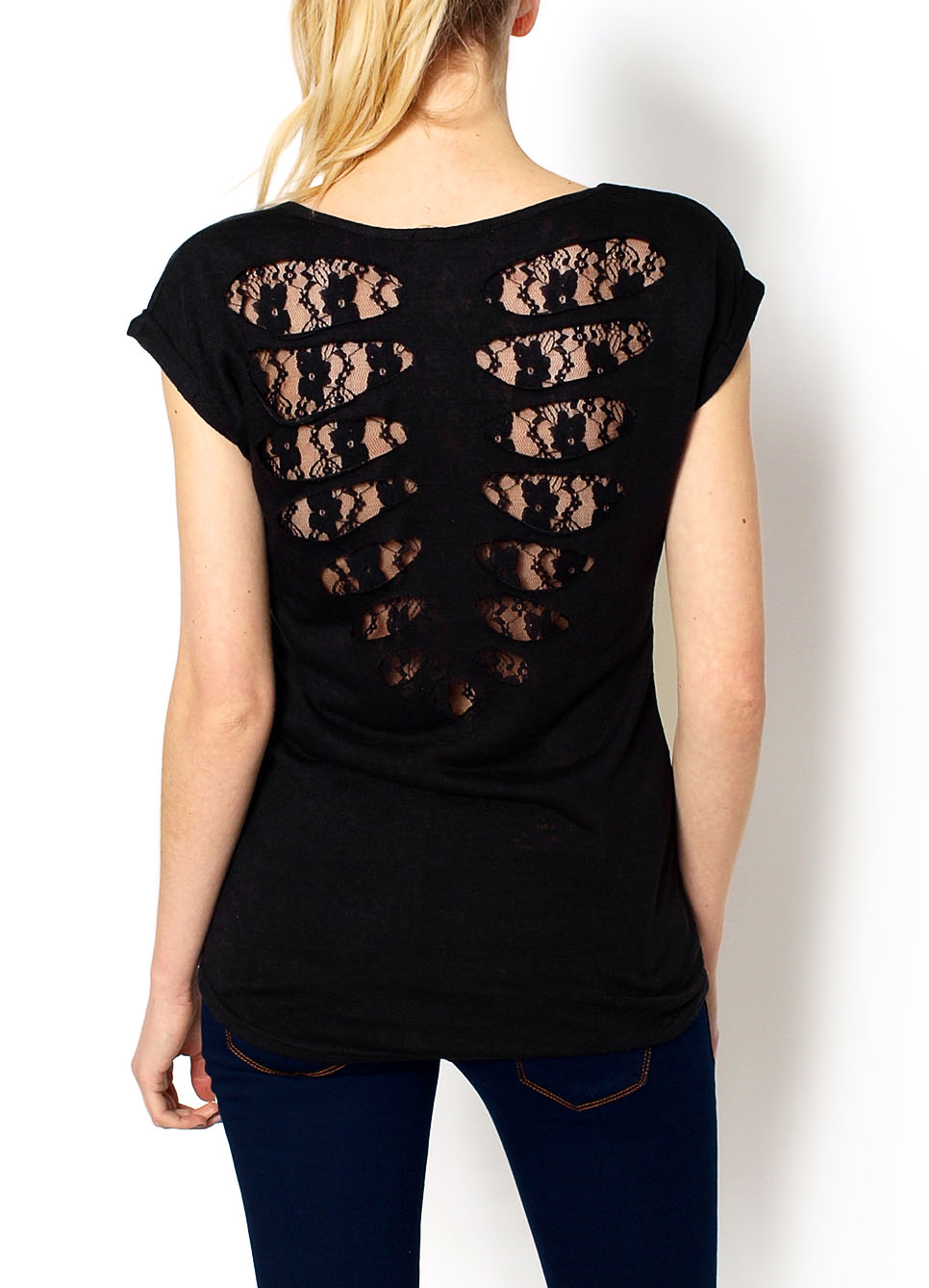 Koszulka z krótkim rękawem, przód gładki. Tył lekko dłuższy, z oryginalnym dziurami oraz stylową koronką. Materiał: 65% bawełna, 35% poliester.Modelka: wzrost 175 cm, na co dzień nosi S/M.