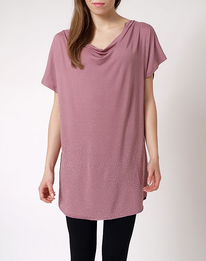 Bawełniana tunika o modnym, szerokim kroju. Dół efektownie zdobiony drobnymi, połyskującymi dżetami. Lejący dekolt typu woda. Krótki rękawek. U dołu, po bokach rozcięcia. Wyjątkowa bluzka wykonana z lekkiego, miłego materiału. Ładnie układa się na sylwetce.Skład: 95% bawełna, 5% poliester.