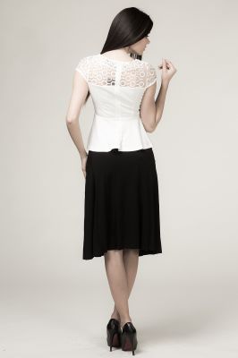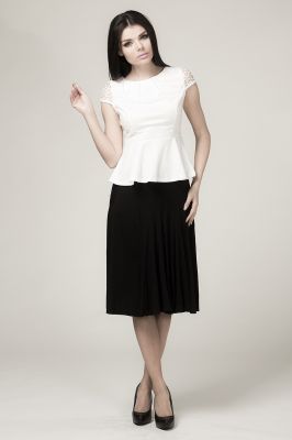 Zjawiskowa bluzka w kolorze kremowym z baskinką. Bluzka zapinana na plecach na kryty zamek. Karczek z tylu i rękawki wykonane z przezroczystej tkaniny w haftowany wzór.
