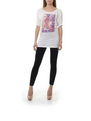 Bardzo oryginalna bluzka typu kimono. Z przodu modny, kolorowy nadruk. Tunika z tyłu z efektownie wyciętym dekoltem, który seksownie eksponuje plecy. Krótkie rękawki zakończone elastycznym ściągaczem. Bluzeczka ładnie dopasowuje się do figury, świetnie prezentuje się w zestawieniu np. z legginsami. Bardzo modny w tym sezonie krój.
