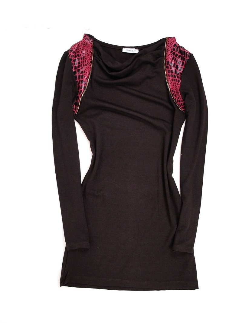 Efektowna długa bluzka / tunika z drapowanym dekoltem.Na barkach zdobiona suwakami i materiałem imitującym skórę węża.