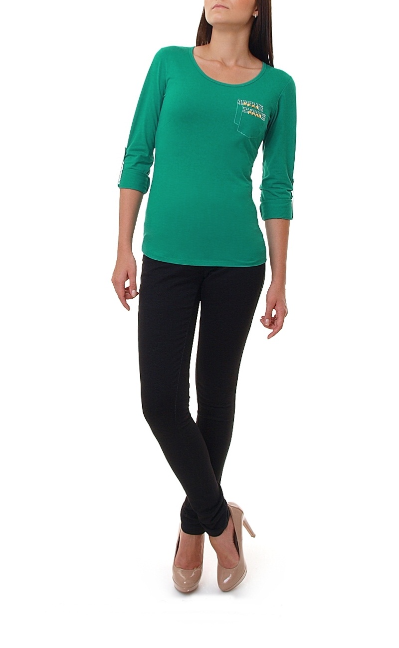 Bawełniana bluzeczka z ozdobną kieszonką z ćwiekami na piersi. Bluzka z długim rękawem z możliwością podwinięcia. Dopasowana i kobieca koszula dostępna w wielu modnych kolorach.Skład: 95% bawełna, 5% lycra