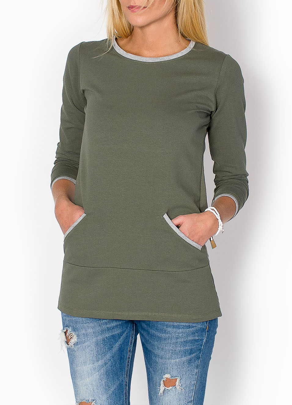 Kobieca bluzeczka o delikatnie trapezowym kroju.Okrągły dekolt. Długie rękawy. Wsuwane kieszenie z przodu. Wszystko wykończone lamówką w kontrastowym kolorze. Wykonana z przyjemnego materiału. Bardzo wygodna i komfortowa w noszeniu.Świetnie prezentuje się na sylwetce. Materiał 95% wiskoza, 5% elastan.Modelka wzrost 175cm, na co dzień nosi rozmiar S/M