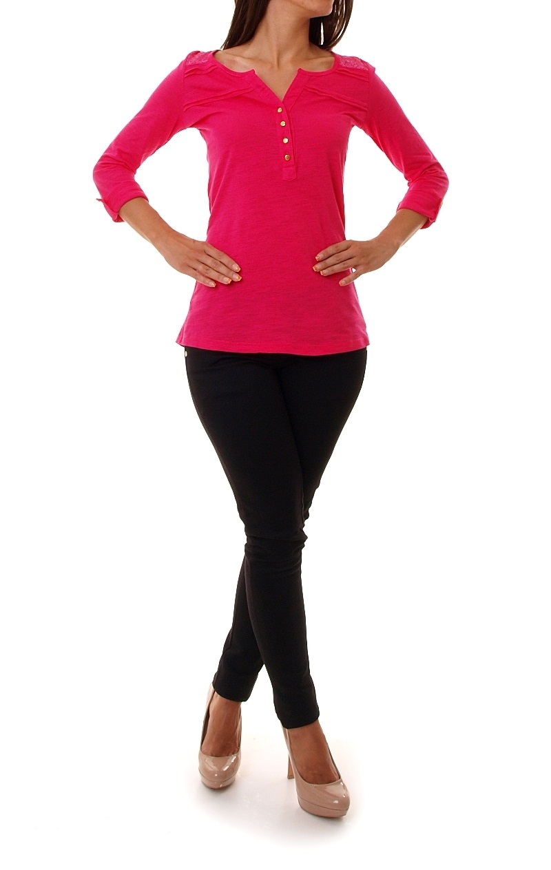 Przyjemna koszulka z koronkową wstawką u góry, zapinana z przodu na złote guziczki. Bawełniana bluzeczka z długim rękawem z możliwością podwinięcia do długości 3/4. Miękka bluzka z seksownym dekoltem. Koszula z delikatnie dłuższym tyłem.Skład: 65% bawełna, 35% poliester