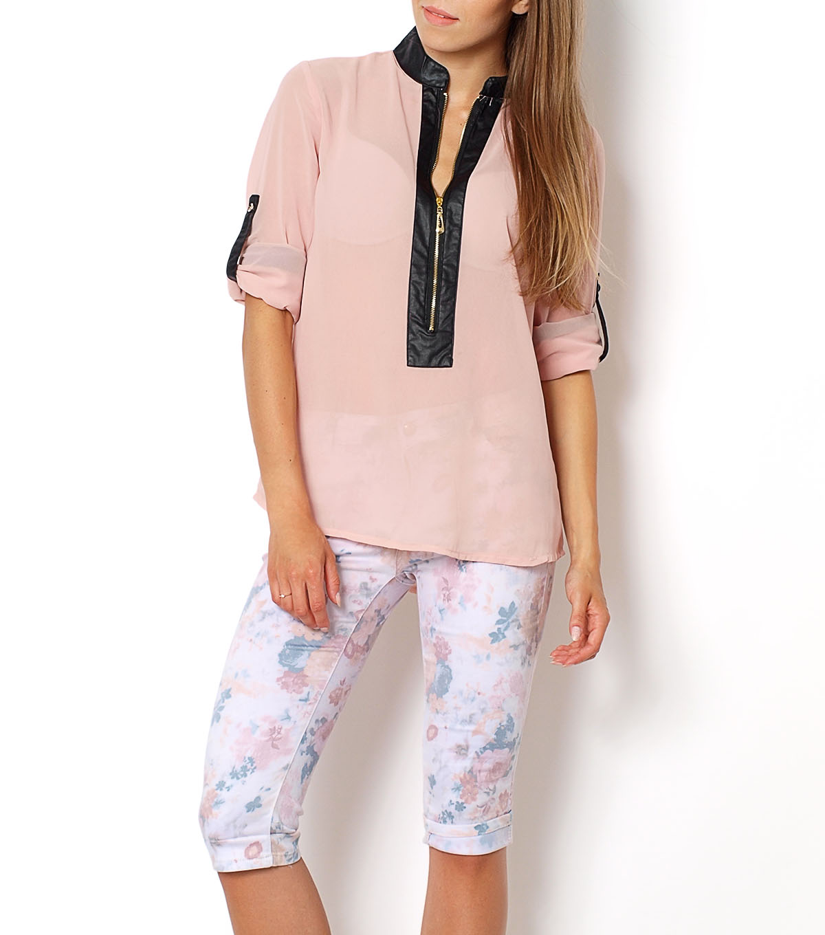 Koszula mgiełka szyfonowa z długim rękawem, możliwość podpięcia do 3/4 długości. Na mankietach, stójce, dekolcie, zapięciach do podwijania rękawów wstawki z a'la skóry. Dodatkowa na dekolcie rozpinany złoty zamek, na makietach złote guziki. Delikatnie dłuższy tył. Materiał 100% poliester.Modelka wzrost 172 cm, na co dzień nosi S/M, rozmiar z prezentacji produktu M