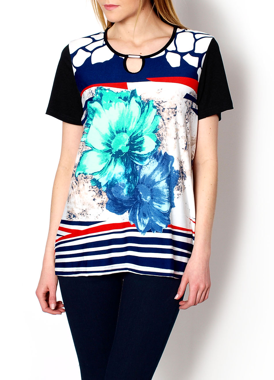 Bluzka, kolorowy nadruk, elastyczny i miękki materiał, fason luźniejszy, rękaw krótki, dekolt okrągły wykończony lamówką, pod dekoltem łezka zdobiona koralikiem.Materiał 65% bawełna, 35% poliesterModelka wzrost 175cm, na co dzień nosi S/M, rozmiar z prezentacji produktu M