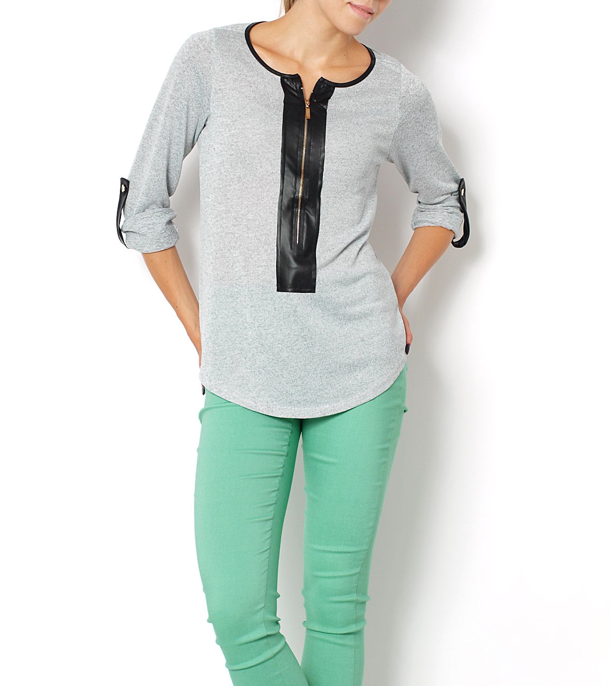 Oryginalna bluzka z długimi rękawami. Z przodu złoty rozpinany zamek, wykończony szeroką pionową wstawką a`la skóra. Okrągły dekolt zakończone lamówką. Możliwość podpięcia rękawów do długości 3/4. Koszulka wykonana z przyjemnego materiału. Efektownie prezentuje się na sylwetce. Świetnie sprawdzi się w wielu stylizacjach. Dostępna w modnych kolorach do wyboru.Skład: 65% bawełna, 35% poliester.