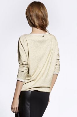 Luźna kimonowa bluzka z połyskiem. Uszyta z dwustronnej dzianiny, z lurexem po prawej stronie, a przyjemnej wiskozie po lewej. Przód i tył cięty przez środek, w cięcie z przodu wszyta szyfonowa wypustka. Tym samym szyfonem jest wykończony dekolt. Dół rękawów wykończony lamówką na wiskozową stronę tkaniny.