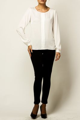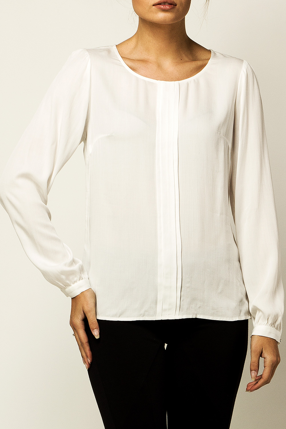 Elegancka bluzka z długim rękawem i zakładkami na przodzie. Ozdobne marszczenia i guziki przy wykończeniach rękawów.