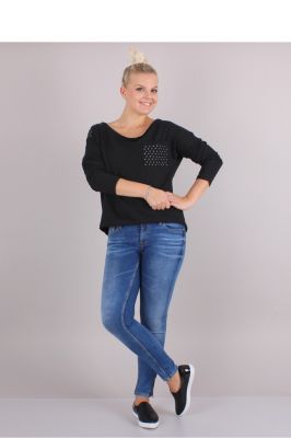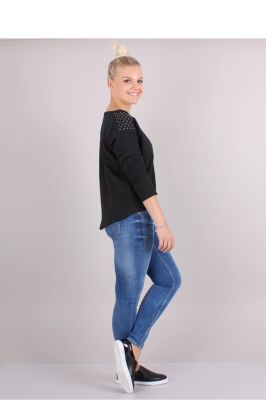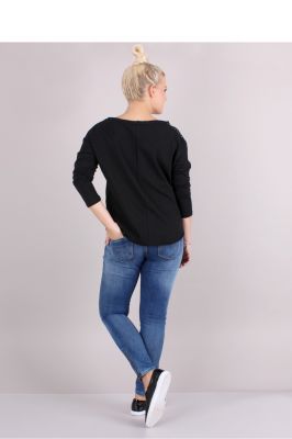 Bluzka damska z długim rękawem. Ma asymetryczny krój- nieco dłuższy tył, zgrabnie zakrywający biodra. Uszyta z mięsistego materiału, ozdabiana ćwiekami na ramionach i kieszonce. Idealnie się układa, jest miękka i bardzo wygodna.