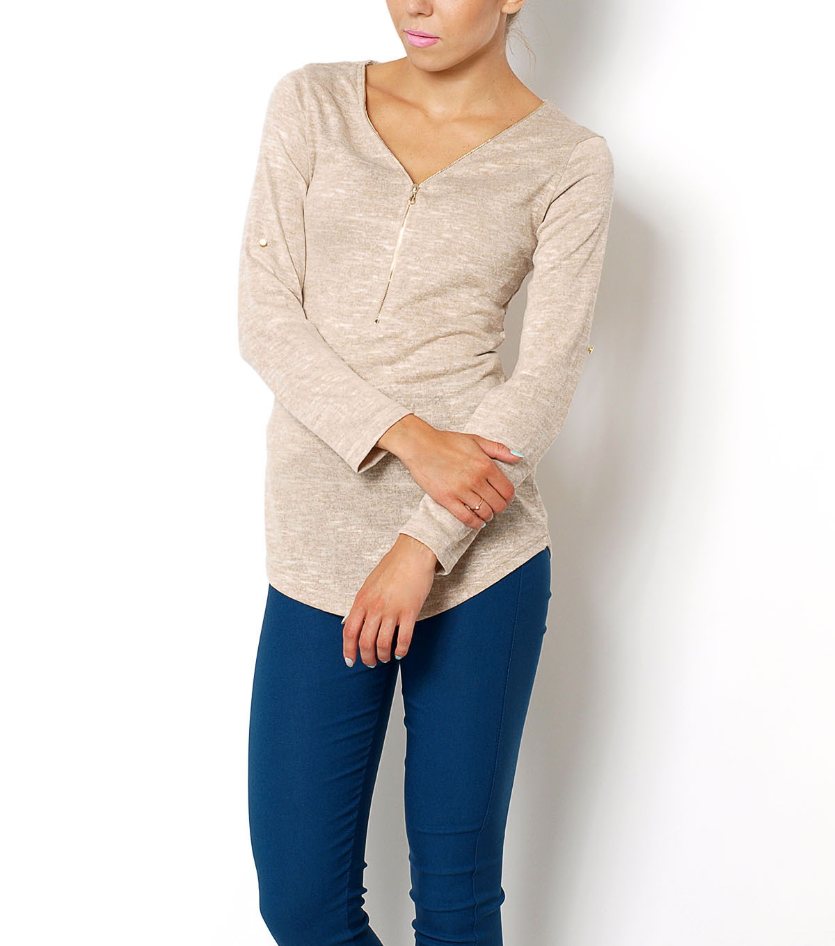 Bluzka z długim rękawem, możliwość podpięcia do 3/4 długości, gustowny dekolt wykończony zlotym rozpinanym zamkiem,cieniowany materiał.Materiał 5% bawełna, 35% poliester. Modelka wzrost 172cm, na co dzień nosi S/M, rozmiar z prezentacji produktu M/L