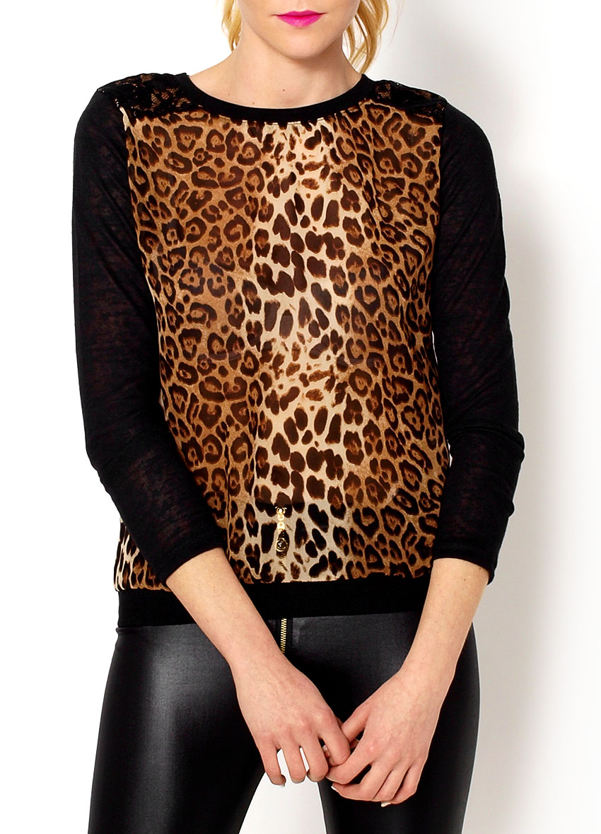 Bluzka, z przodu szyfonowa panterka, tył i rekawy z materiały lekko prześwitującego i cieniowanego, dół i rękawy zakończone ściągaczem, na ramionach wstawki z koronki.Materiał 65% bawełna, 35% poliester.Modelka wzrost 175cm, na co dzień nosi S/M, rozmiar z prezentacji produktu S/M