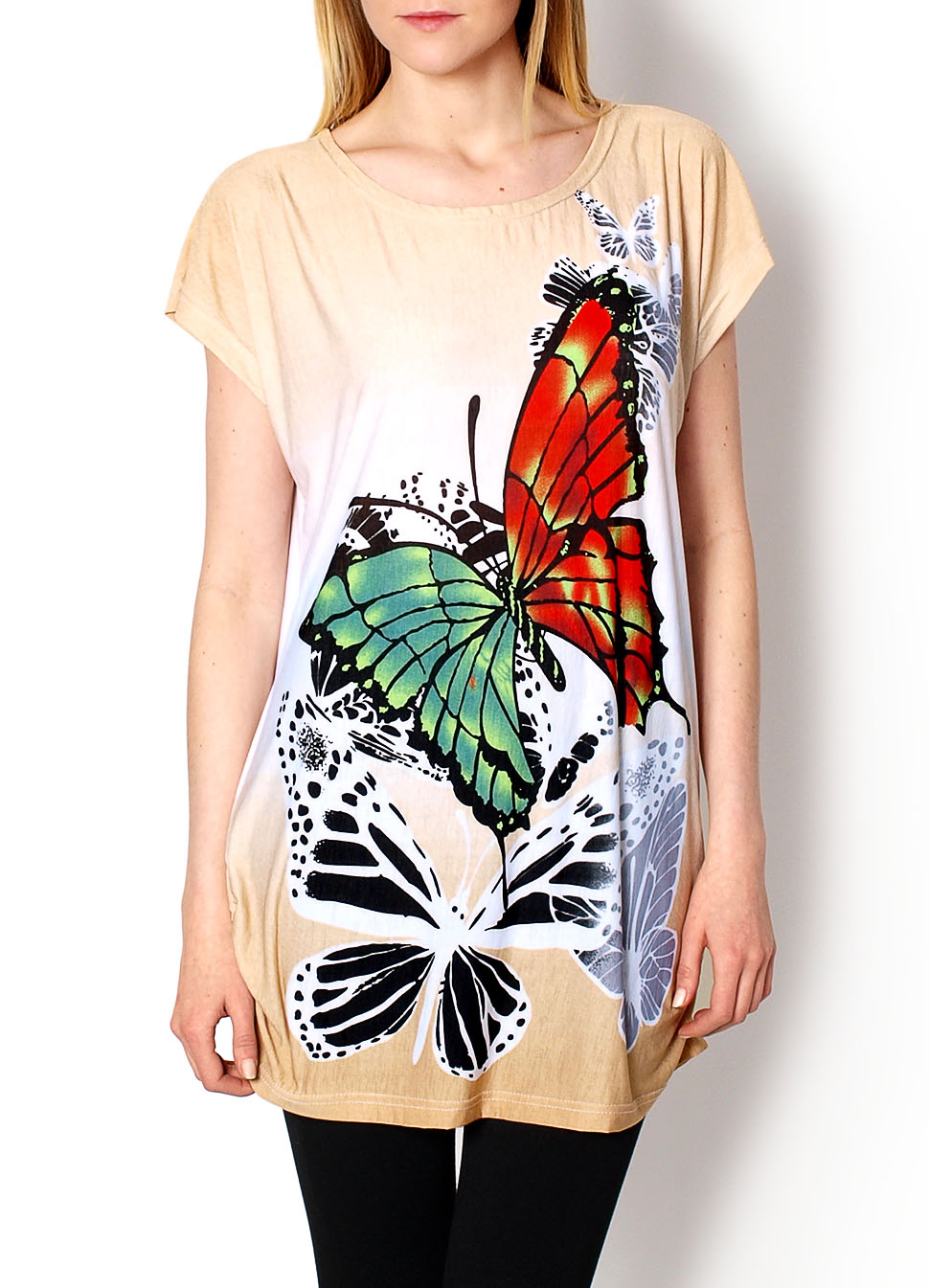 Bluzka o dłuższym, oversizowym kroju. Rękawy krótkie, dekolt okrągły. Na dole, po obu bokach marszczenie podszyte elastyczną gumką. Aplikacja z motylem zdobi całą powierzchnię bluzki. Zwiewny, elastyczny materiał dopasowujący się do ciała. Materiał 65% bawełna, 35% poliester.Modelka wzrost 175cm, na co dzień nosi S/M, rozmiar z prezentacji produktu M/L
