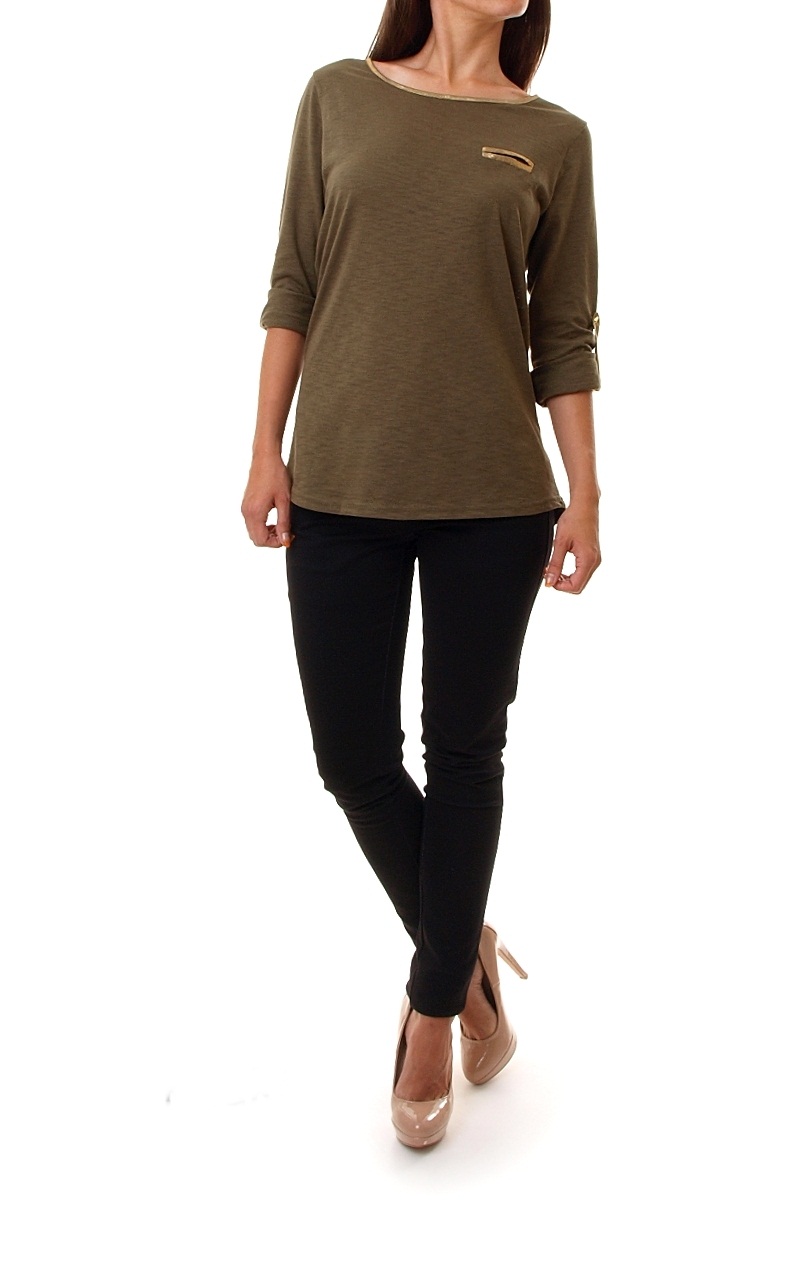 Super komfortowa bawełniana bluzka ze złotymi wstawkami. Koszulka z długim rękawem z możliwością podwinięcia. Z przodu imitacja kieszonki wykończona złotą obwódką. Zapinana z tyłu na złoty zamek. Asymetryczna bluzeczka z delikatnie dłuższym tyłem.Skład: 65% bawełna, 35% poliester