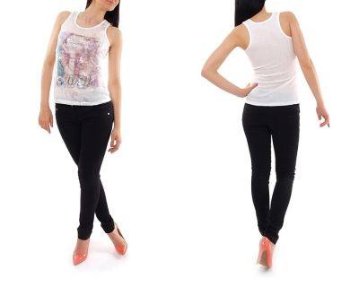 Top na grubych ramiączkach z aplikacją 3D i z cekinami. Styl bokserki z wycięciem na plecach. Prążkowana struktura z tyłu.