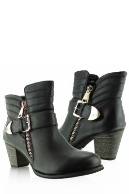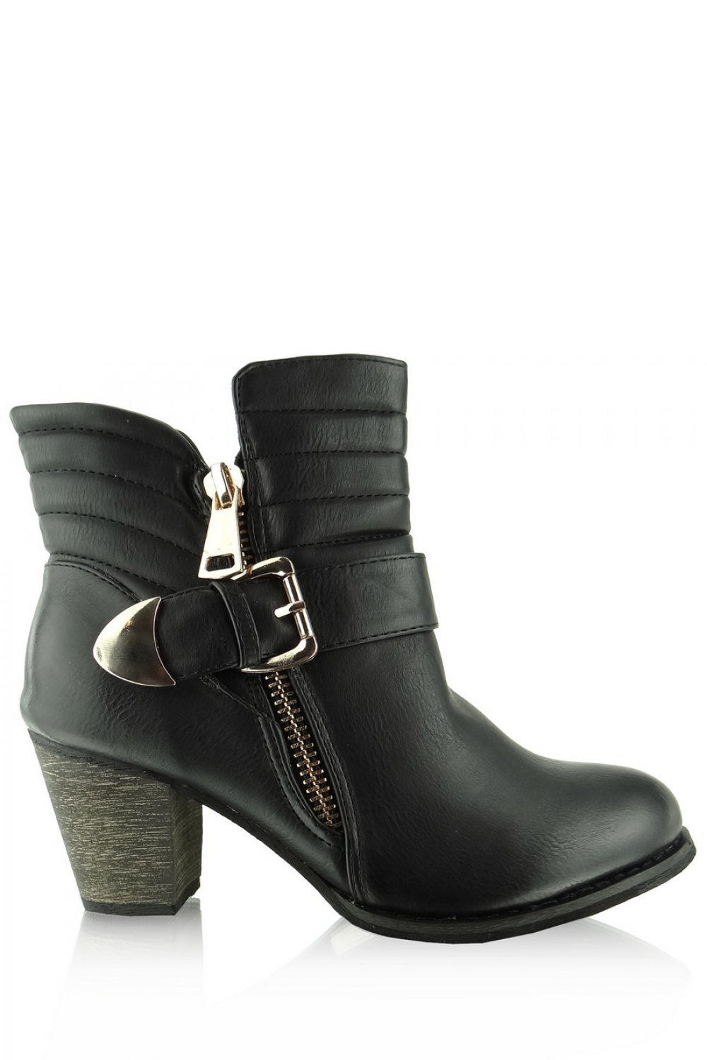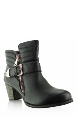 Stylowe botki na szerokim i bardzo stabilnym obcasie. Mają pikowana cholewkę, ozdabianą złotym suwaczkiem. Po wewnętrznej stronie suwaczek ułatwiający zakładanie. Buty świetnie wyglądają do wąskich spodni, typu slim. Są wygodne i bardzo uniwersalne.