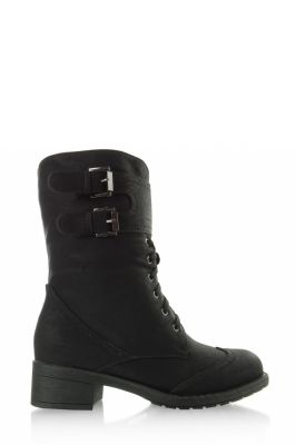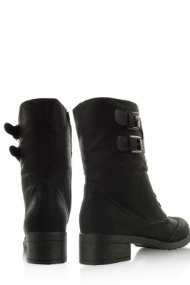 Stylowe botki glany sznurowane, z paskiem na górze zapinanym na dwie klamry. Mają bardzo oryginalny krój i obszycia na noskach. Po wewnętrznej stronie suwak ułatwiający zakładanie. W całości wyścielone futerkiem.Materiał: skóra ekologiczna.Ocieplacz : futerko.