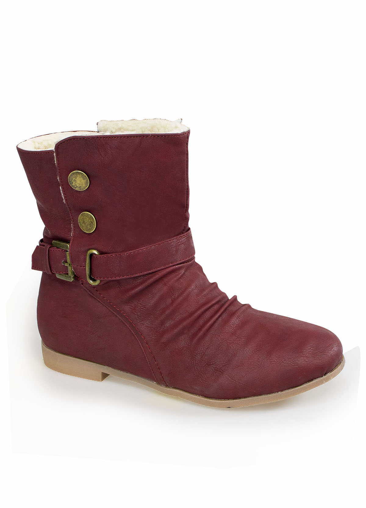 Damskie botki na płaskiej podeszwie w modnym odcieniu bordo. Wkładka i wnętrze cholewki wyłożone ciepłym kożuszkiem. Zapinane na zatrzaski po obu stronach, co ułatwia ich nakładanie i zdejmowanie. Obcas z kauczuku - ok.2,5 cm. Zdobione klamerką. Wygodne krótsze buty do codziennego użytku. Idealne na chłodną porę. Pasują zarówno do spódnic i spodni, jak i legginsów. Ciekawy kolor ożywi i doda charakteru luźnym stylizacjom.