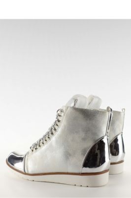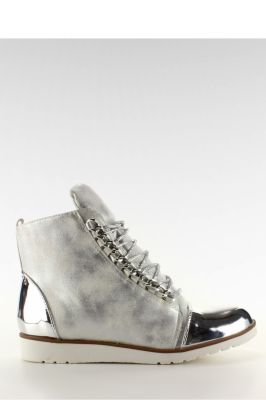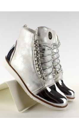 Stylowe botki damskie z eleganckimi metalicznymi elementami na noskach i pięcie. Zamiast tradycyjnych oczek przy sznurowaniu mają elegancki łańcuszek. Oprócz sznurowania buty posiadają suwak ułatwiający zakładanie.