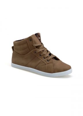 Trampki z wyższą cholewką, model sznurowany. Fason z matowej skóry ekologicznej. Podeszwa biała, wyściółka w kratkę.