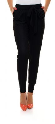 Spodnie wykonane z miękkiego, przyjemnego w dotyku materiału (imitacja jeansu) z przewagą bawełny. Bryczesy wiązane w pasie tasiemką. Przednie kieszenie ozdobione drobnymi dżetami. Chinosy posiadają w pasie szlufki, dzięki czemu możliwa jest stylizacja z paskiem. Skład: 65% bawełna, 35% elastan